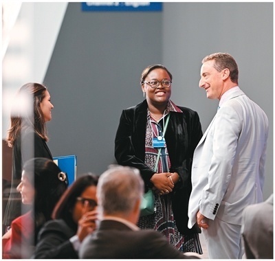 图为2025年6月,外国嘉宾在世界经济论坛第十六届新领军者年会(2025夏季达沃斯论坛)现场交流讨论。 新华社记者 李 然摄