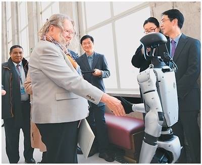 图为2025年11月,联合国日内瓦办事处总干事瓦罗瓦娅(前)在“人工智能 团结共治”高级别对话会前与机器人握手互动。 新华社记者 连 漪摄