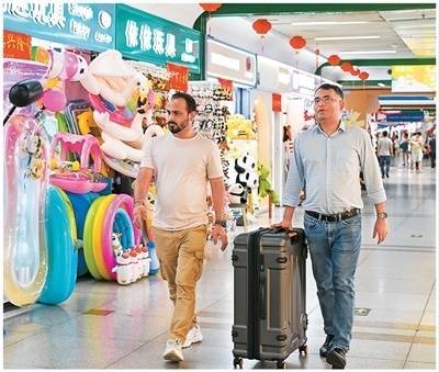图为今年5月,带着行李箱的外国客商在浙江义乌国际商贸城准备采购样品。 新华社记者 陈 朔摄